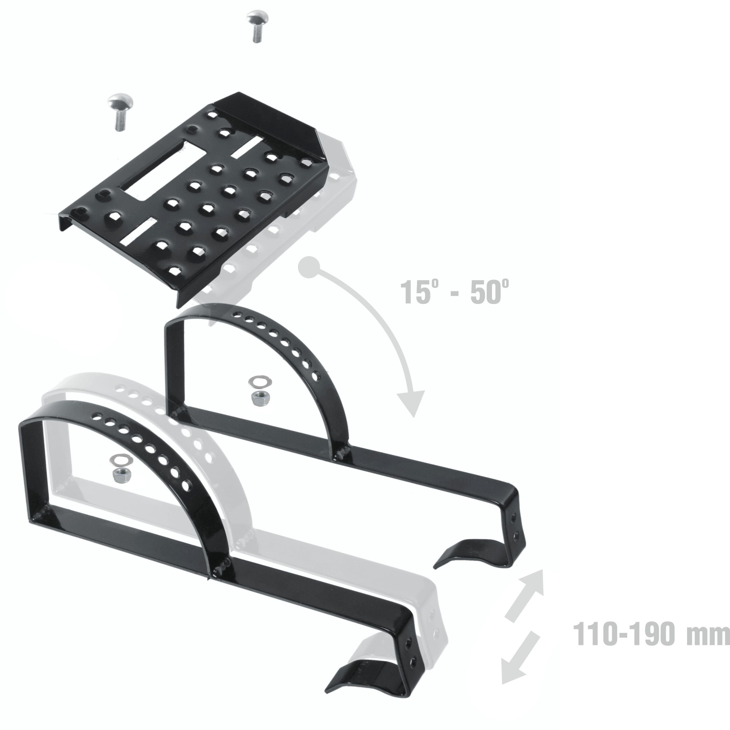 PAROTEC® Chimney sweep safety step TECTO -   double supported step made of hot-dip galvanized and powder-coated steel sheet. The steps should be installed at 40-50 cm intervals, depending on the pitch of the roof. Special anti-slip embossing make it easier to move between levels. The kit gives you the ability to adjust both the angle of the platform in the range of 15°- 50° and the width of the bracket spacing of 110 -190 mm, which makes it easy to adapt to the tile layout. The use of two supports gives stability similar to a chimney bench, while retaining the advantages of a step with a single support.