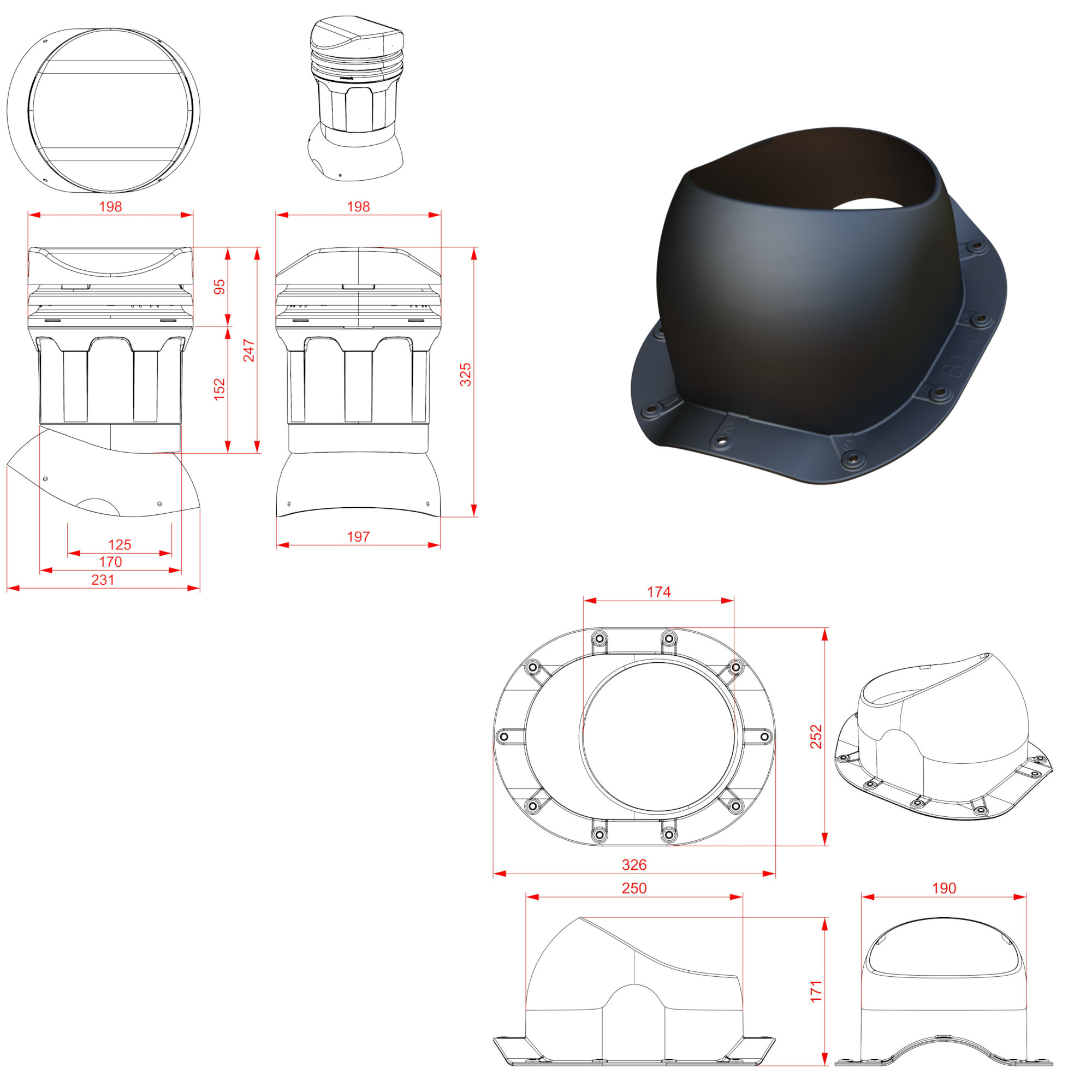 Sewer vent DN125  - A product used for venting sewer risers. It is part of the ventilation set, which allows you to maintain uniform aesthetics of the roof slope finish. It is mounted on roof adapters in the adjustment range from 0° to 50°. The package contains all the necessary components for installation on the roofing.