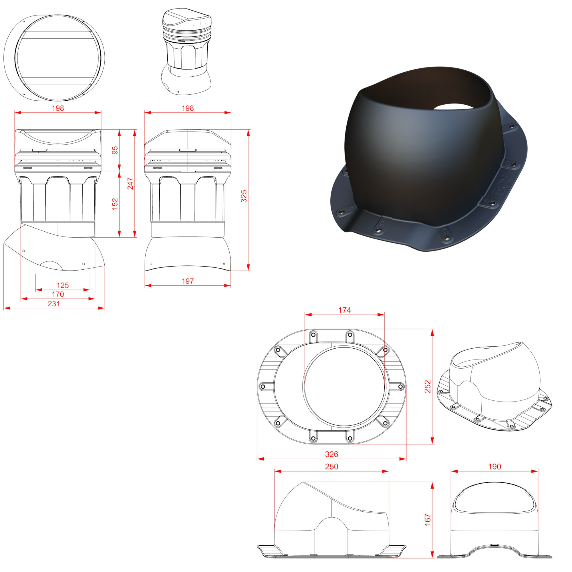 Sewer vent DN125  - A product used for venting sewer risers. It is part of the ventilation set, which allows you to maintain uniform aesthetics of the roof slope finish. It is mounted on roof adapters in the adjustment range from 0° to 50°. The package contains all the necessary components for installation on the roofing.