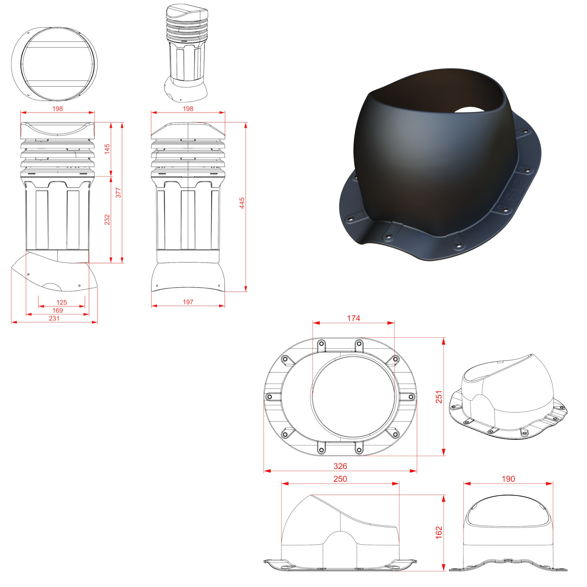 Roof vent with condensate drain DN125 The version with a condensate drain allows excess condensate to drain outside the roof vent. The roof vent consists of elements connected by the "click" method, which allows for quick assembly and disassembly of the cowl, for example, for technical inspection. Mounted within the range of adjustment from 0° to 50°. The package contains all the components necessary for the installation of the roof vent. For a list of roofing sheet and panel sheet models, see the appendix.