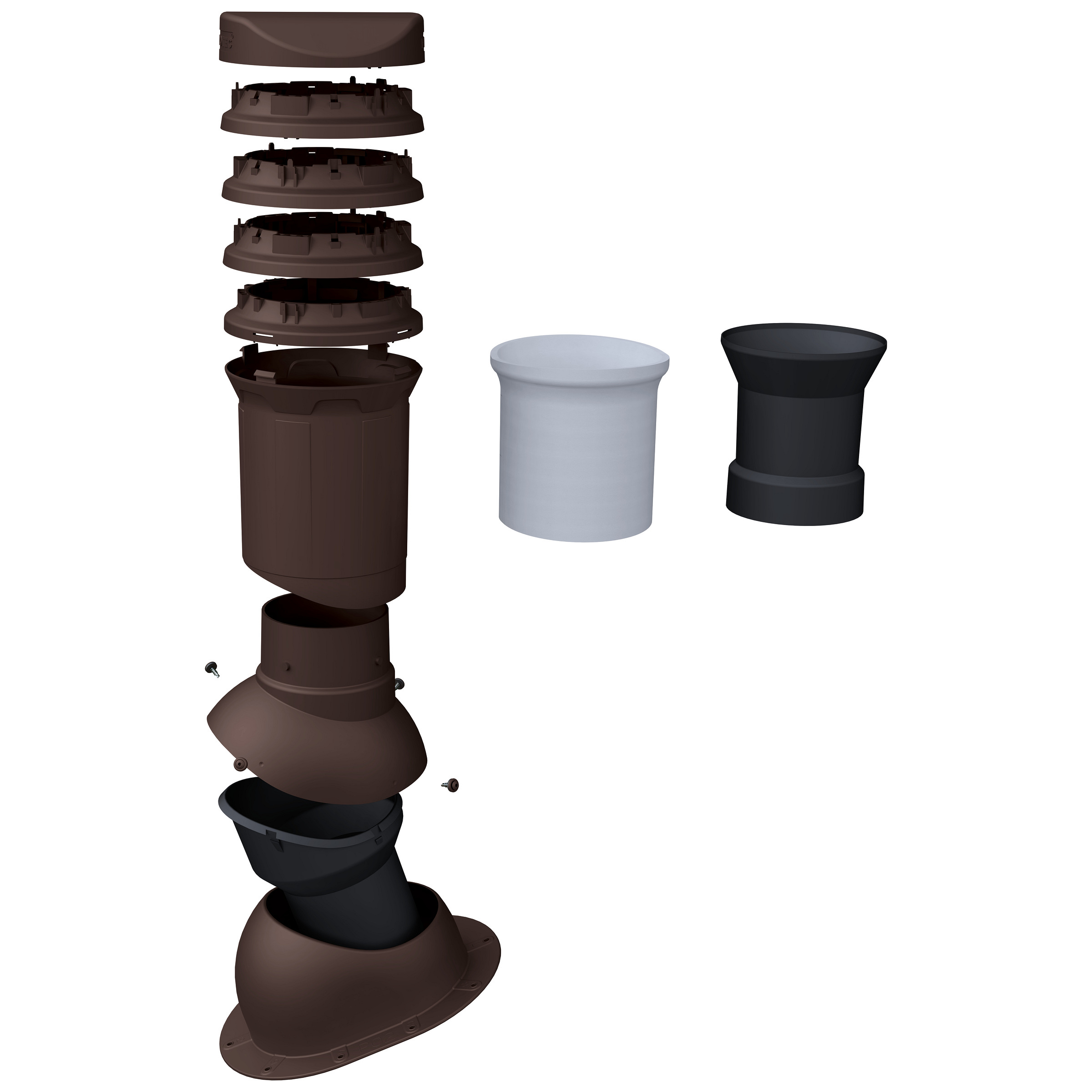 Insulated roof vent DN125 - The insulated version is provided with an additional thermal insulation layer that minimizes the formation of condensation in the roof vent duct. The roof vent consists of elements connected by the "click" method, which allows for quick assembly and disassembly of the cowl, for example, for technical inspection. Mounted within the range of adjustment from 0° to 50°. The package contains all the components necessary for the installation of the roof vent. For a list of roofing sheet and panel sheet models, see the appendix.