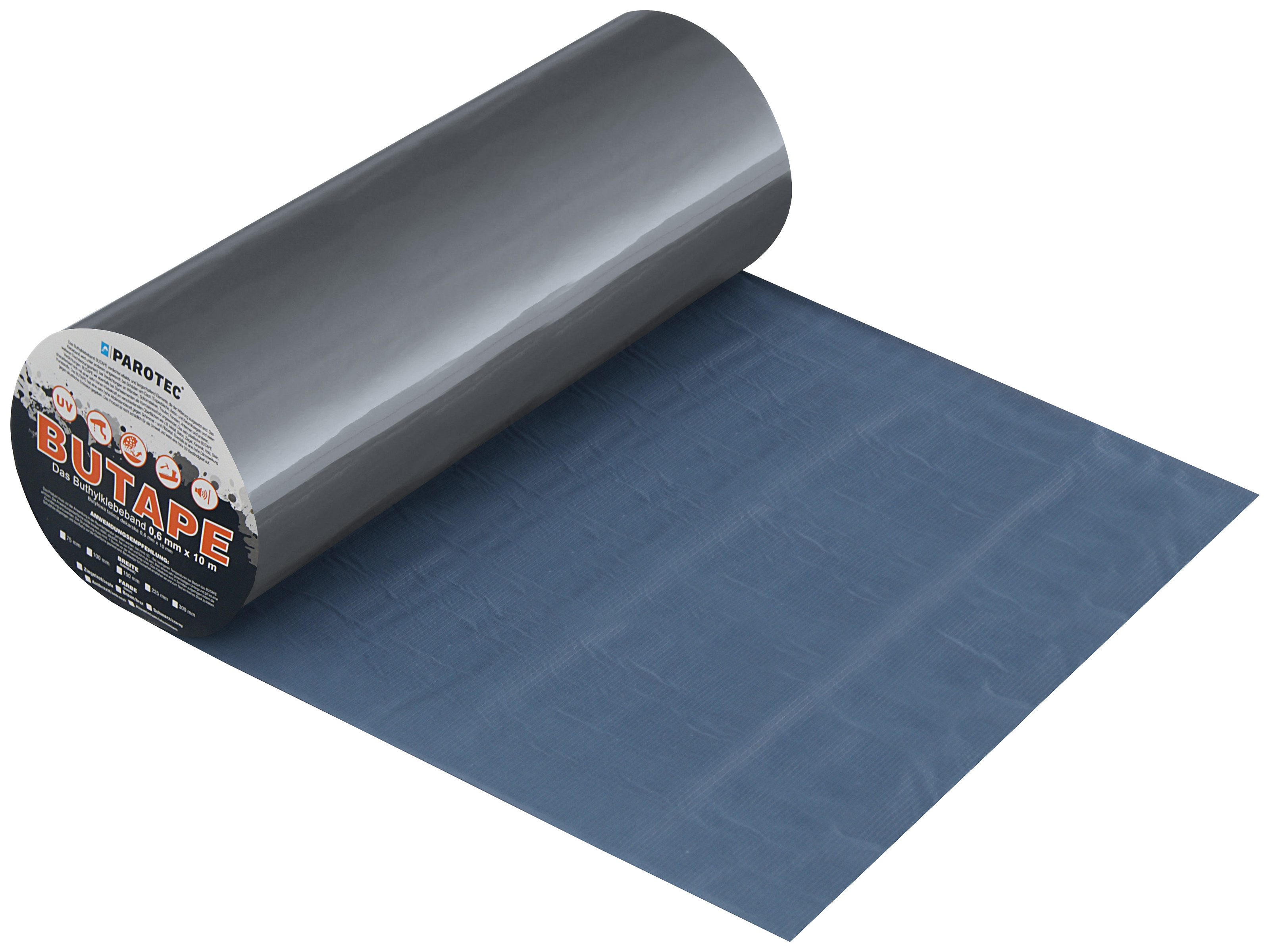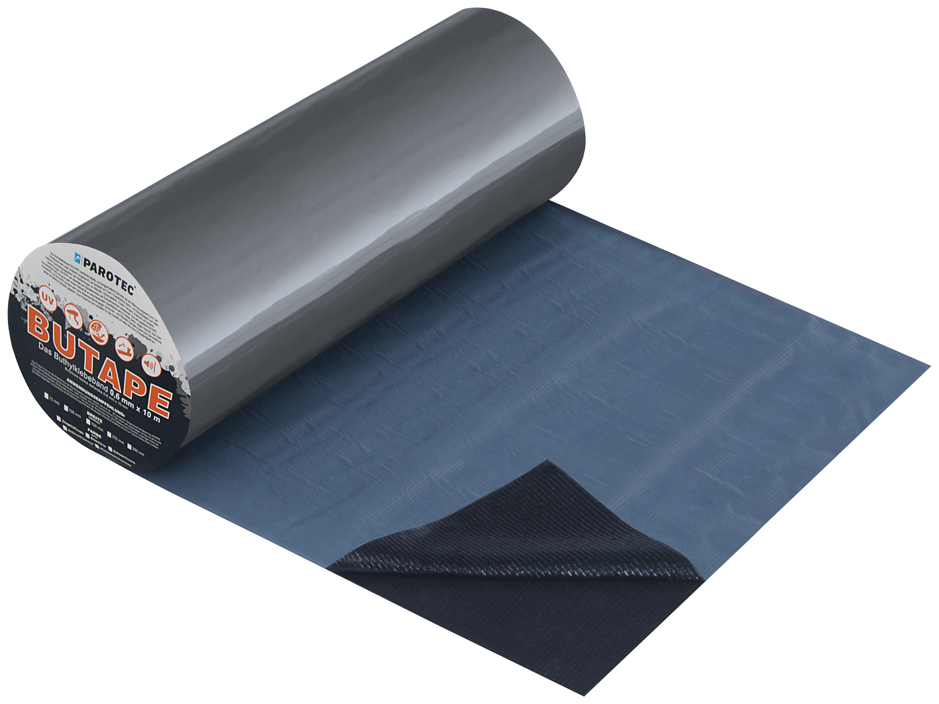 PAROTEC® BUTAPE butyl roofing tape - Showing self-vulcanizing properties butyl tape made of butyl compound and aluminum PET film laminate. It has excellent adhesion to most building materials such as metal, wood, ceramic, concrete, stone, plastic and some types of PVC. Resistant to water, moisture, weather and UV radiation. Instantly seals roof flashings, masts, antennas and roof hatches. Resistant to aging processes. It comes in several sizes and colors.